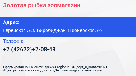 Золотая рыбка, зоомагазин по адресу Еврейская АО, Биробиджан, Пионерская, 69 в дальнейшем Организация, размещена в следующих категориях: