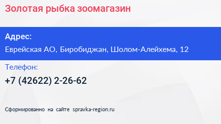 Золотая рыбка, зоомагазин по адресу Еврейская АО, Биробиджан, Шолом-Алейхема, 12 в дальнейшем Организация, размещена в следующих категориях:
