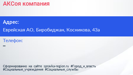 АКСоя, компания по адресу Еврейская АО, Биробиджан, Косникова, 43а в дальнейшем Организация, размещена в следующих категориях: