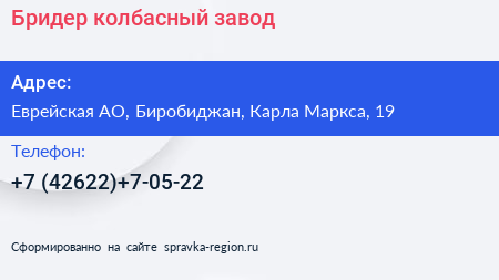 Бридер, колбасный завод по адресу Еврейская АО, Биробиджан, Карла Маркса, 19 в дальнейшем Организация, размещена в следующих категориях: