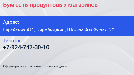 Бум, сеть продуктовых магазинов по адресу Еврейская АО, Биробиджан, Шолом-Алейхема, 20 в дальнейшем Организация, размещена в следующих категориях: