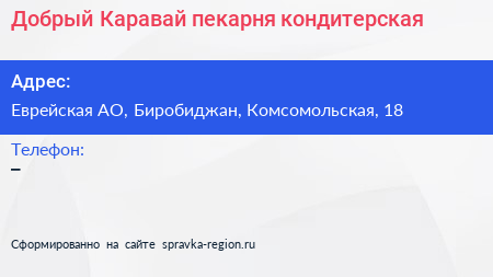 Добрый Каравай, пекарня-кондитерская по адресу Еврейская АО, Биробиджан, Комсомольская, 18 в дальнейшем Организация, размещена в следующих категориях:
