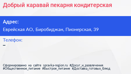 Добрый каравай, пекарня-кондитерская по адресу Еврейская АО, Биробиджан, Пионерская, 39 в дальнейшем Организация, размещена в следующих категориях: