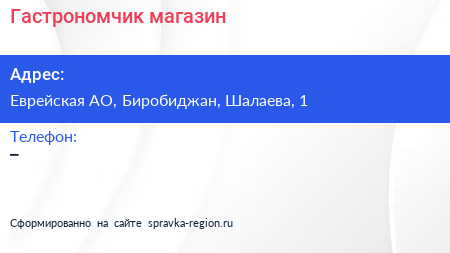 Гастрономчик, магазин по адресу Еврейская АО, Биробиджан, Шалаева, 1 в дальнейшем Организация, размещена в следующих категориях: