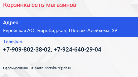 Корзинка, сеть магазинов по адресу Еврейская АО, Биробиджан, Шолом-Алейхема, 39 в дальнейшем Организация, размещена в следующих категориях: