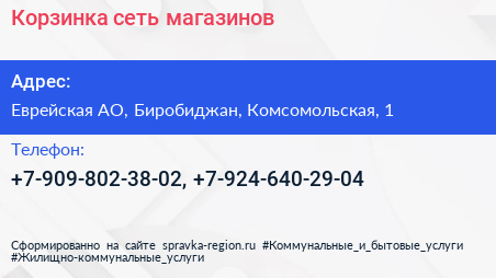 Корзинка, сеть магазинов по адресу Еврейская АО, Биробиджан, Комсомольская, 1 в дальнейшем Организация, размещена в следующих категориях: