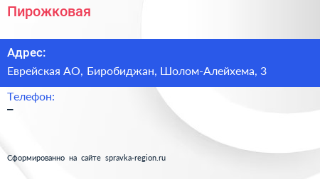 Пирожковая по адресу Еврейская АО, Биробиджан, Шолом-Алейхема, 3 в дальнейшем Организация, размещена в следующих категориях: