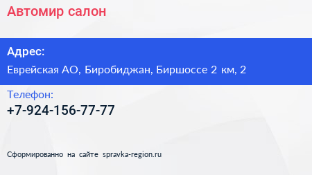 Автомир, салон по адресу Еврейская АО, Биробиджан, Биршоссе 2 км, 2 в дальнейшем Организация, размещена в следующих категориях:
