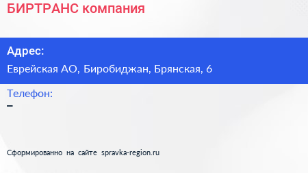 БИРТРАНС, компания по адресу Еврейская АО, Биробиджан, Брянская, 6 в дальнейшем Организация, размещена в следующих категориях: