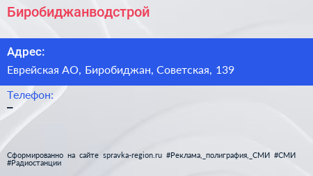 Биробиджанводстрой по адресу Еврейская АО, Биробиджан, Советская, 139 в дальнейшем Организация, размещена в следующих категориях: