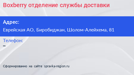 Boxberry, отделение службы доставки по адресу Еврейская АО, Биробиджан, Шолом-Алейхема, 81 в дальнейшем Организация, размещена в следующих категориях: