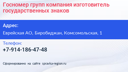 Госномер групп, компания-изготовитель государственных знаков по адресу Еврейская АО, Биробиджан, Комсомольская, 1 в дальнейшем Организация, размещена в следующих категориях: