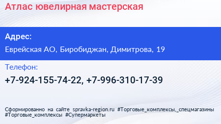 Атлас, ювелирная мастерская по адресу Еврейская АО, Биробиджан, Димитрова, 19 в дальнейшем Организация, размещена в следующих категориях: