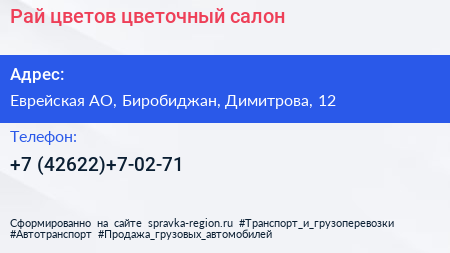 Рай цветов, цветочный салон по адресу Еврейская АО, Биробиджан, Димитрова, 12 в дальнейшем Организация, размещена в следующих категориях: