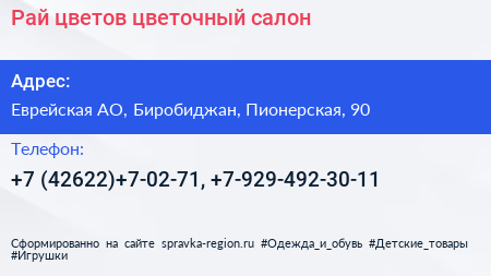 Рай цветов, цветочный салон по адресу Еврейская АО, Биробиджан, Пионерская, 90 в дальнейшем Организация, размещена в следующих категориях:
