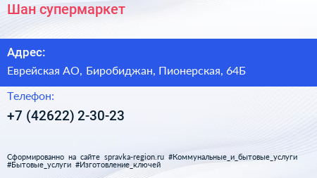 Шан, супермаркет по адресу Еврейская АО, Биробиджан, Пионерская, 64Б в дальнейшем Организация, размещена в следующих категориях: