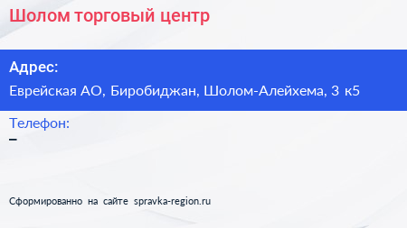 Шолом, торговый центр по адресу Еврейская АО, Биробиджан, Шолом-Алейхема, 3 к5 в дальнейшем Организация, размещена в следующих категориях: