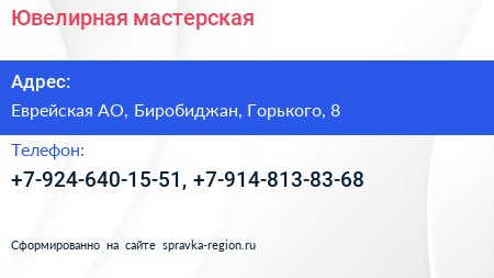 Ювелирная мастерская по адресу Еврейская АО, Биробиджан, Горького, 8 в дальнейшем Организация, размещена в следующих категориях:
