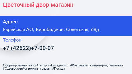 Цветочный двор, магазин по адресу Еврейская АО, Биробиджан, Советская, 68д в дальнейшем Организация, размещена в следующих категориях:
