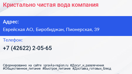 Кристально чистая вода, компания по адресу Еврейская АО, Биробиджан, Пионерская, 39 в дальнейшем Организация, размещена в следующих категориях: