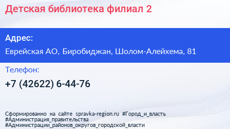 Детская библиотека, филиал №2 по адресу Еврейская АО, Биробиджан, Шолом-Алейхема, 81 в дальнейшем Организация, размещена в следующих категориях: