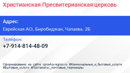 Христианская Пресвитерианская церковь по адресу Еврейская АО, Биробиджан, Чапаева, 2Б в дальнейшем Организация, размещена в следующих категориях: