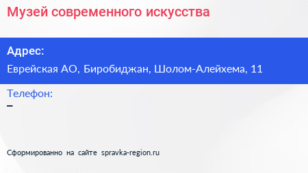 Музей современного искусства по адресу Еврейская АО, Биробиджан, Шолом-Алейхема, 11 в дальнейшем Организация, размещена в следующих категориях: