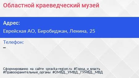 Областной краеведческий музей по адресу Еврейская АО, Биробиджан, Ленина, 25 в дальнейшем Организация, размещена в следующих категориях: