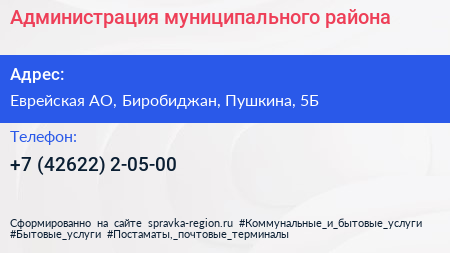 Администрация муниципального района по адресу Еврейская АО, Биробиджан, Пушкина, 5Б в дальнейшем Организация, размещена в следующих категориях: