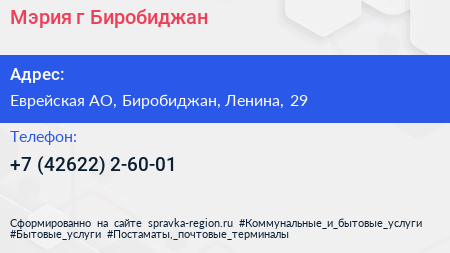 Мэрия, г. Биробиджан по адресу Еврейская АО, Биробиджан, Ленина, 29 в дальнейшем Организация, размещена в следующих категориях: