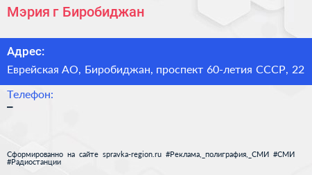 Мэрия, г. Биробиджан по адресу Еврейская АО, Биробиджан, проспект 60-летия СССР, 22 в дальнейшем Организация, размещена в следующих категориях: