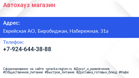 Автохауз, магазин по адресу Еврейская АО, Биробиджан, Набережная, 31а в дальнейшем Организация, размещена в следующих категориях: