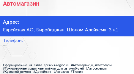 Автомагазин по адресу Еврейская АО, Биробиджан, Шолом-Алейхема, 3 к1 в дальнейшем Организация, размещена в следующих категориях: