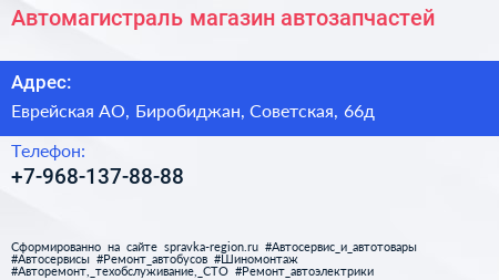 Автомагистраль, магазин автозапчастей по адресу Еврейская АО, Биробиджан, Советская, 66д в дальнейшем Организация, размещена в следующих категориях: