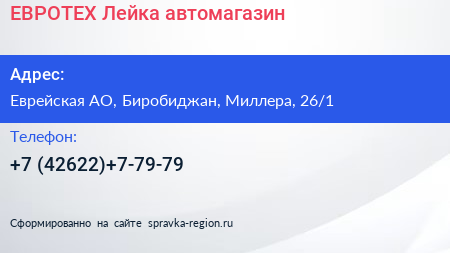 ЕВРОТЕХ Лейка, автомагазин по адресу Еврейская АО, Биробиджан, Миллера, 26/1 в дальнейшем Организация, размещена в следующих категориях: