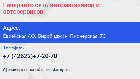 Гиперавто, сеть автомагазинов и автосервисов по адресу Еврейская АО, Биробиджан, Пионерская, 70 в дальнейшем Организация, размещена в следующих категориях: