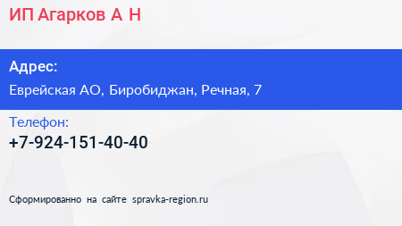 ИП Агарков А.Н. по адресу Еврейская АО, Биробиджан, Речная, 7 в дальнейшем Организация, размещена в следующих категориях:
