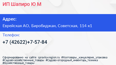 ИП Шапиро Ю.М. по адресу Еврейская АО, Биробиджан, Советская, 114 к1 в дальнейшем Организация, размещена в следующих категориях: