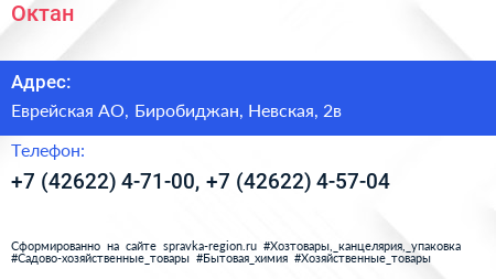 Октан по адресу Еврейская АО, Биробиджан, Невская, 2в в дальнейшем Организация, размещена в следующих категориях: