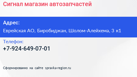 Сигнал, магазин автозапчастей по адресу Еврейская АО, Биробиджан, Шолом-Алейхема, 3 к1 в дальнейшем Организация, размещена в следующих категориях: