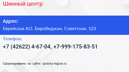 Шинный центр по адресу Еврейская АО, Биробиджан, Советская, 123 в дальнейшем Организация, размещена в следующих категориях: