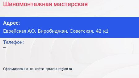 Шиномонтажная мастерская по адресу Еврейская АО, Биробиджан, Советская, 42 к1 в дальнейшем Организация, размещена в следующих категориях: