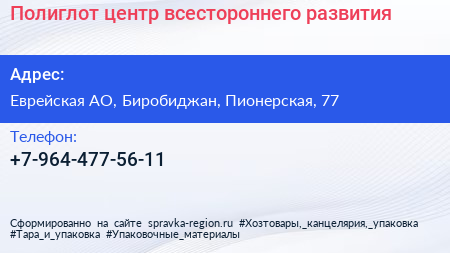 Полиглот, центр всестороннего развития по адресу Еврейская АО, Биробиджан, Пионерская, 77 в дальнейшем Организация, размещена в следующих категориях: