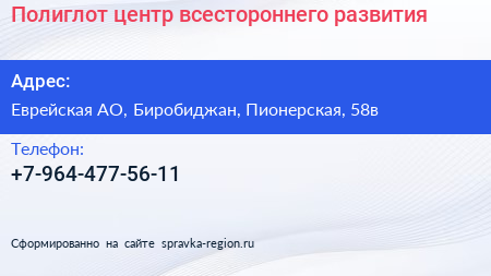 Полиглот, центр всестороннего развития по адресу Еврейская АО, Биробиджан, Пионерская, 58в в дальнейшем Организация, размещена в следующих категориях: