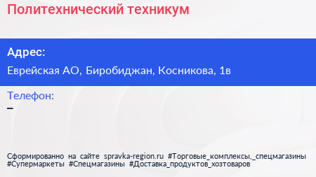 Политехнический техникум по адресу Еврейская АО, Биробиджан, Косникова, 1в в дальнейшем Организация, размещена в следующих категориях: