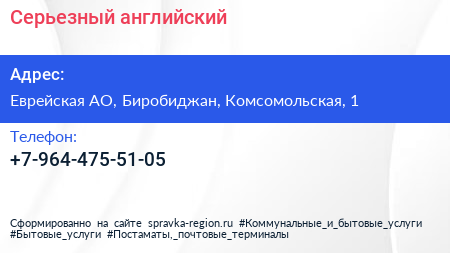 Серьезный английский по адресу Еврейская АО, Биробиджан, Комсомольская, 1 в дальнейшем Организация, размещена в следующих категориях: