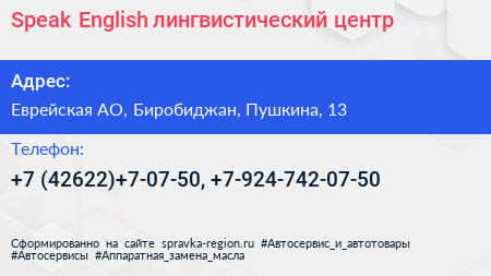 Speak English, лингвистический центр по адресу Еврейская АО, Биробиджан, Пушкина, 13 в дальнейшем Организация, размещена в следующих категориях:
