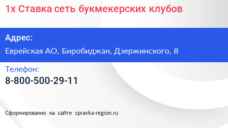 1x Ставка, сеть букмекерских клубов по адресу Еврейская АО, Биробиджан, Дзержинского, 8 в дальнейшем Организация, размещена в следующих категориях: