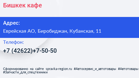 Бишкек, кафе по адресу Еврейская АО, Биробиджан, Кубанская, 11 в дальнейшем Организация, размещена в следующих категориях: