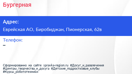 Бургерная по адресу Еврейская АО, Биробиджан, Пионерская, 62в в дальнейшем Организация, размещена в следующих категориях:
